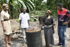 DSC 9084 Igaezuma Okoroba, Head, Sustainability, Dangote Cement Plc(l) and  Peter Anagbe, Head, Alternative Fuel Project, Dangote Cement Plc (r) observing the palm oil kernel extraction process while Hammed Adekunle, a  Palm Oil miller (Second left) and Mama Abibat Salawu (second right) explains the process at Buoye farm settlement, Ikire.