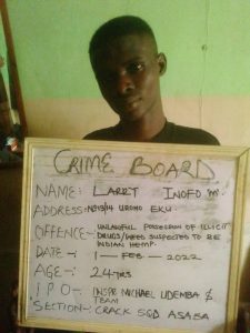 A crack team of the Delta State Police Command, acting on intelligence, has arrested a drug suspect, 24 year old Larry Onifon, following a raid on black spots in Okwuchi quarters of the state, while others took to their heels.