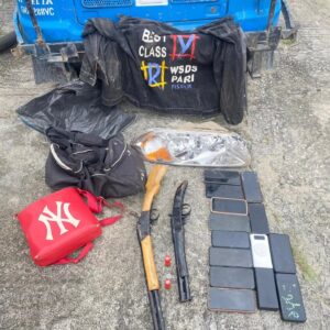 The chase continued into First Marine Quarters, where the rider and passengers abruptly abandoned the tricycle and fled through adjoining streets. The operatives recovered the tricycle and conducted a thorough search, which led to the discovery of two (2) locally fabricated double-barrel guns. Other items recovered at the scene included: Nine (9) assorted mobile phones, four (4) power banks, and a screwdriver.