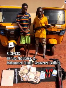 ‘In a different development, on 25/04/2022 at about 1430hrs, Police Operatives serving in Anti-Cultism Squad of the Command, acted on a distress call and arrested one Haruna Abdulazeez aged 22, of New Artisan Market, Enugu and Mohammed Falani aged 32, of Nkporogu, New Layout, Emene Enugu, while their cohorts escaped. They suspects are alleged to have at gunpoint robbed their victims of cash and other valuables, at New Layout, Emene. Their arrest led to the recovery of 1 Pump Action gun with 5 live and 6 expended cartridges, 1 Dagger, 2 tricycles with reg. numbers: ENU 678 WE and NSH 254 UD respectively, cash sum of sixty five thousand, one hundred and fifty naira (N65,150.00) and 1 Tecno IPOD. The case will be charged to court upon conclusion of investigation.’