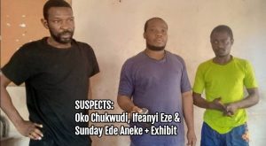 ‘Also, in continuation of a case of conspiracy and kidnapping, Police Operatives of the Command serving in the CP Monitoring Unit, between 24th and 22nd March, 2022, arrested one Oko Chukwudi (a.k.a. “Anka-Dede”) aged 27, Ifeanyi Eze (a.k.a. “Abrinanwa”) aged 36 and Sunday Ede Aneke (a native doctor a.k.a. Aneke-Ikenga) aged 34, all of Akpugo, Nkanu West LGA, for being members of the criminal gang alleged to had conspired and kidnapped one Amechi Oguama (male) on 20/10/2021. It will be recall that three (3) other members of the said kidnapping gang namely: one Chioma Uwa (female and a.k.a. “Dr. Happiness”), Chekwube Nwatu (male and a.k.a. “Cheche”) and Emeka Uwa (male a.k.a. “Akimbo”), had earlier been arrested, arraigned in court and remanded in Correctional Custodial Centre. All the newly arrested suspects confessed to having been actively involved in the kidnapping of the said victim and the receipt of ransom of over ten million naira (N10,000,000.00) by the criminal gang, while 1 Berretta pistol with 1 .9mm round of live ammunition was recovered from them. Meanwhile, the suspects will be further arraigned in court and prosecuted alongside the previous suspects, once supplementary investigation into the case is concluded.’