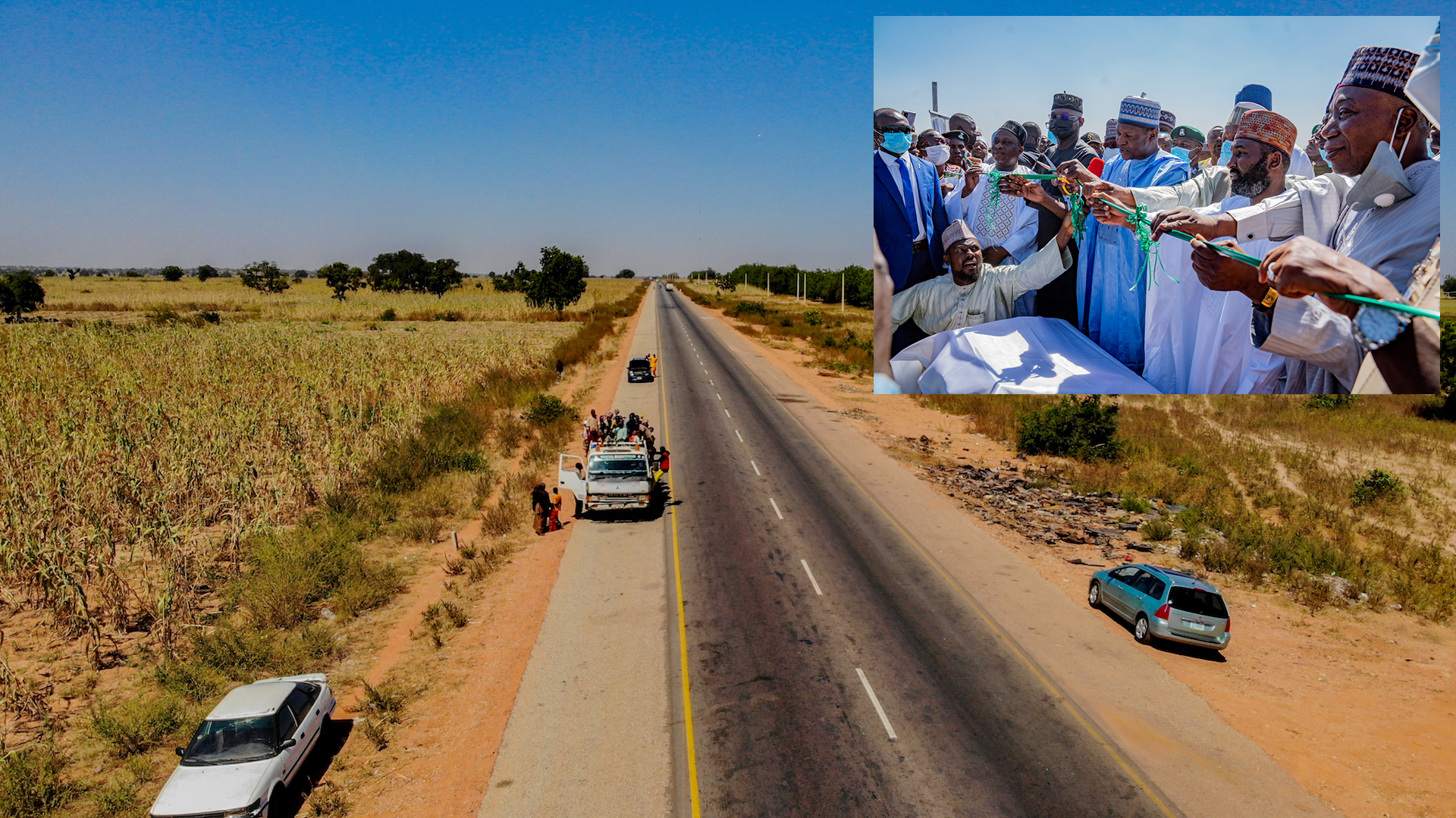 A view of the  Sokoto – Tambuwal -Jega – Kontagora – Makera Road Phase I & II in Sokoto and Kebbi States during its Commissioning and Handover on Thursday, 25th November 2021.INSET: Representative of the President and Hon. Minister of Justice and Attorney – General of the Federation, Mr Abubakar Malami, SAN (2nd Left), Hon. Minister of Works and Housing, Mr Babatunde Fashola, SAN (left),  Governor of Kebbi State, Mr. Abubakar Atiku Bagudu (middle), Chairman, Senate Committee on Works and Senator representing Kebbi Central Senatorial District, Senator Adamu Aliero (right), Chairman, House  Committee on Works, Hon. Abubakar Kabir Abubakar (2nd right) and others during the commissioning and Handover of Sokoto – Tambuwal -Jega – Kontagora – Makera Road Phase I & II in Sokoto and Kebbi States on Thursday, 25th November 2021 at Koko/Bese LGA, Kebbi State.