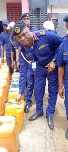 In line with the renewed and re-invigorated efforts of the Commandant, Nigeria Security and Civil Defence Corps (NSCDC), Lagos State Command, Commandant Eweka Edenabu Okoro, against all forms of economic sabotage and other kinds of criminality, in Lagos State, the Marine and Anti-Vandal team of the Badagry division, Lagos Command, who were on routine surveillance and patrol on Tuesday, 27th September, 2022, at about 23:45hrs, intercepted and recovered about seven hundred and twenty (720), thirty (30) litres’ keg each, of oil products identified, to be Premium Motor Spirit (PMS), also known as petrol, along Yafin creek, Badagry, where they had been kept in batches, by yet to be identified, suspected oil vandals, with the motive to reload them all into a boat and proceed on their journey.