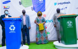 According to Kadiri, “The bins which came in green and blue colours, are for LAWMA’s strategic recycling campaign for residents to containerize their waste.”