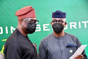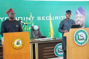Oyo State Governor, Seyi Makinde (left) and his Ogun State Counterpart, Dapo Abiodun during the Ogun/Oyo Joint Security Meeting held at Presidential Lodge, Abeokuta, Ogun State. PHOTO: Oyo State Government.