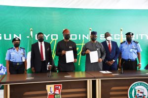 Oyo State Governor, Seyi Makinde (third left); his Ogun State counterpart, Dapo Abiodun (third right); Oyo State, Attorney General and Commissioner for Justice, Prof Oyelowo Oyewo (second left); his Ogun State counterpart, Oluwasina Ogunbade (second right); Oyo State Commissioner for Police, Ngozi Onadeko (left) and Ogun State Commissioner of Police, Lanre Bankole during the Ogun/Oyo Joint Security meeting held at Presidential Lodge, Abeokuta, Ogun State. PHOTO: Oyo State Government.