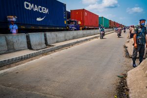 Personnel of the Sub-Contractors, Hitech Construction Construction Company Ltd. at work at the Mile 2 end of Section II during an inspection tour by the Hon. Minister of Works and Housing, Mr. Babatunde Fashola, SAN of the Reconstruction of Apapa – Oworonshoki -Ojota Expressway: Section I Sub- Sections A, B, D and Sections 3 & 4 in Lagos State on Monday, 28th February 2022.