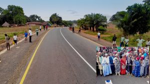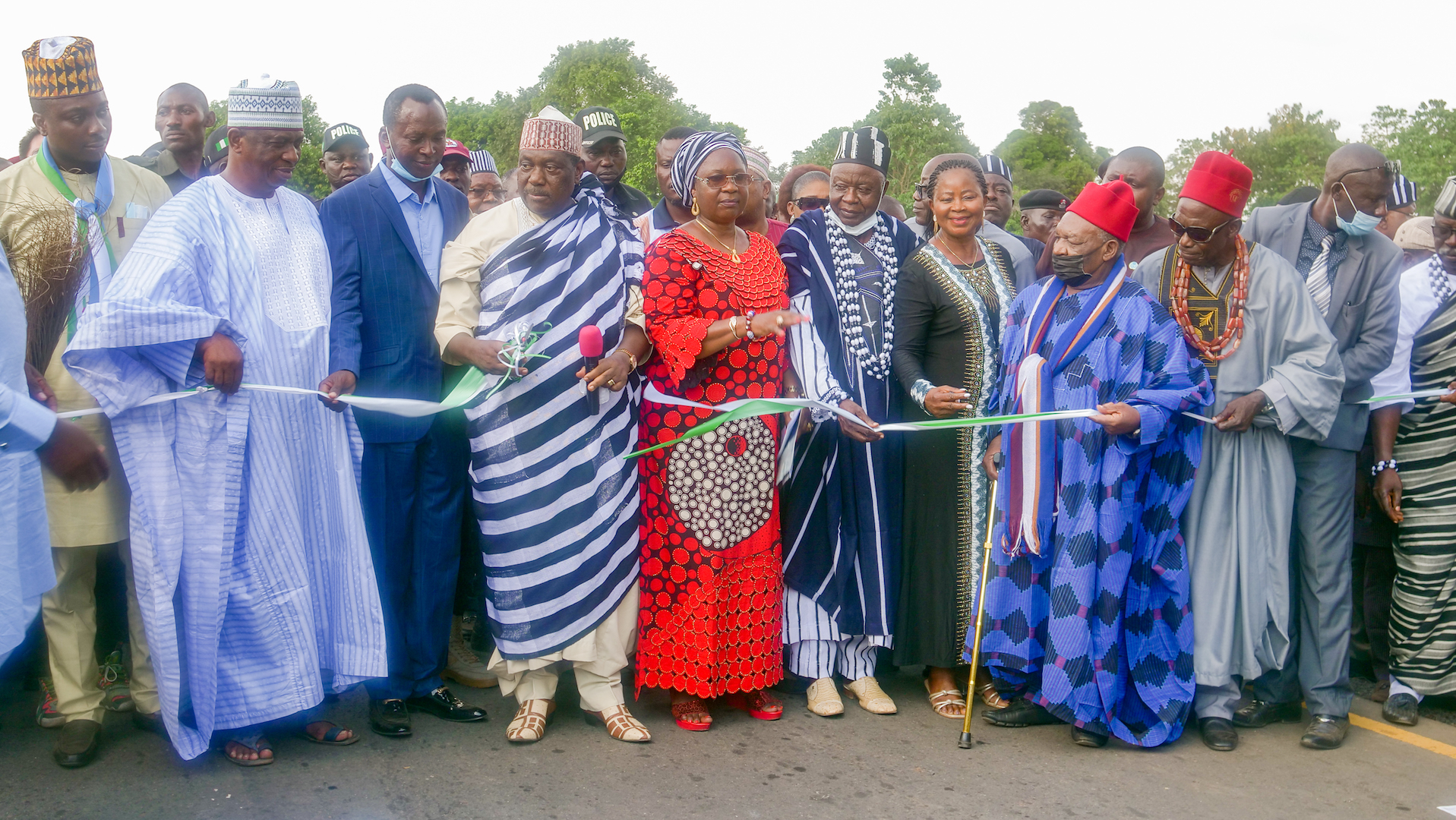 A view of the Vandeikya – Obudu Cattle Ranch Road Phases I and II in Benue State during its commissioning by representative of President Muhammadu Buhari and Hon. Minister of Special Duties and Inter – Governmental Affairs, Senator George Akume , representative of the Hon.Minister of Works and Housing & Director Highways, North Central, Engr. Rugba Emenoge, Ter Kunav Community, HRH. Chief Nyiyongo Achiaku, House of Representative member representing Vandeikya/Konshisha, Federal Constituency, Hon. Hembe Herman ,Chairman, Vandeikya LGA, Hon. (Mrs) Paulyn Kukase (5th left) and others on Monday, 29th November 2021 .