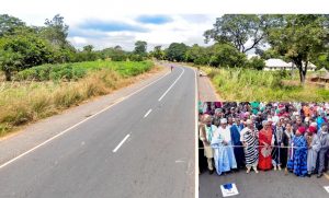 A view of the Vandeikya – Obudu Cattle Ranch Road Phases I and II in Benue State.INSET: Representative of President Muhammadu Buhari and Hon. Minister of Special Duties and Inter – Governmental Affairs, Senator George Akume (4th left), representative of the Hon.Minister of Works and Housing & Director Highways, North Central, Engr. Rugba Emenoge (3rd left), Ter Kunav Community, HRH. Chief Nyiyongo Achiaku (3rd right), House of Representative member representing Vandeikya/Konshisha, Federal Constituency, Hon. Hembe Herman (2nd left),Chairman, Vandeikya LGA, Hon. (Mrs) Paulyn Kukase (5th left) and others during the commissioning and Handover of Vandeikya – Obudu Cattle Ranch Road Phases I and II in Benue State on Monday, 29th November 2021 .
