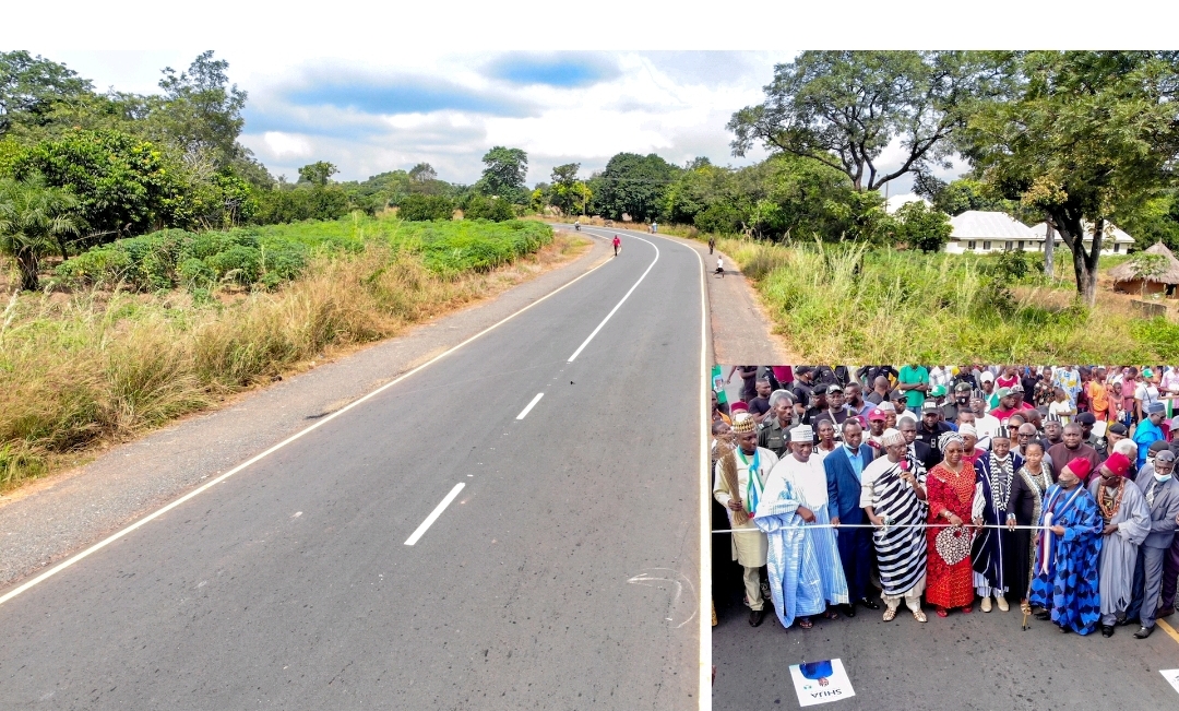 A view of the Vandeikya - Obudu Cattle Ranch Road Phases I and II in Benue State.INSET: Representative of President Muhammadu Buhari and Hon. Minister of Special Duties and Inter - Governmental Affairs, Senator George Akume (4th left), representative of the Hon.Minister of Works and Housing & Director Highways, North Central, Engr. Rugba Emenoge (3rd left), Ter Kunav Community, HRH. Chief Nyiyongo Achiaku (3rd right), House of Representative member representing Vandeikya/Konshisha, Federal Constituency, Hon. Hembe Herman (2nd left),Chairman, Vandeikya LGA, Hon. (Mrs) Paulyn Kukase (5th left) and others during the commissioning and Handover of Vandeikya - Obudu Cattle Ranch Road Phases I and II in Benue State on Monday, 29th November 2021 .
